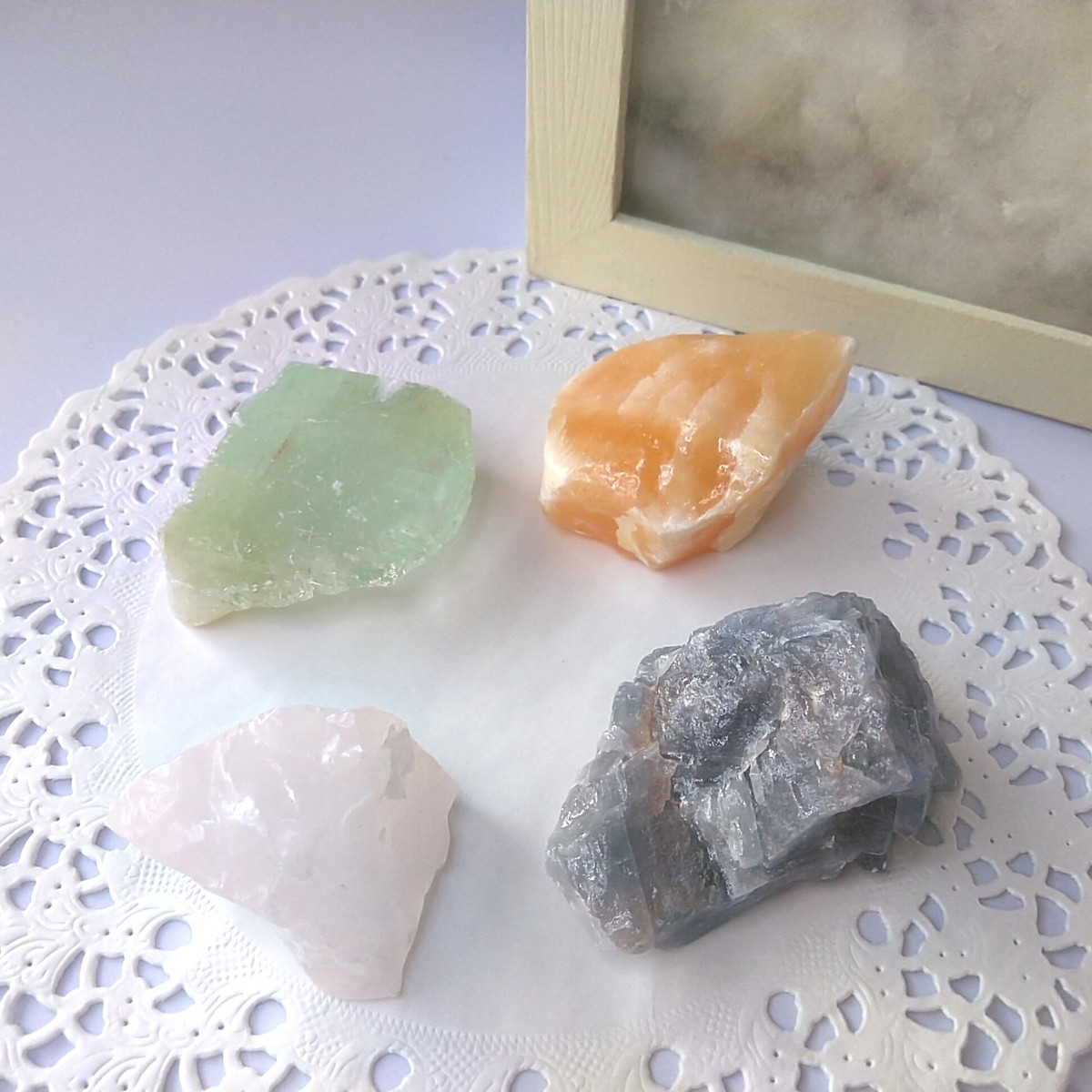 グリーン、ピンク、ブルー、オレンジのカルサイトです。