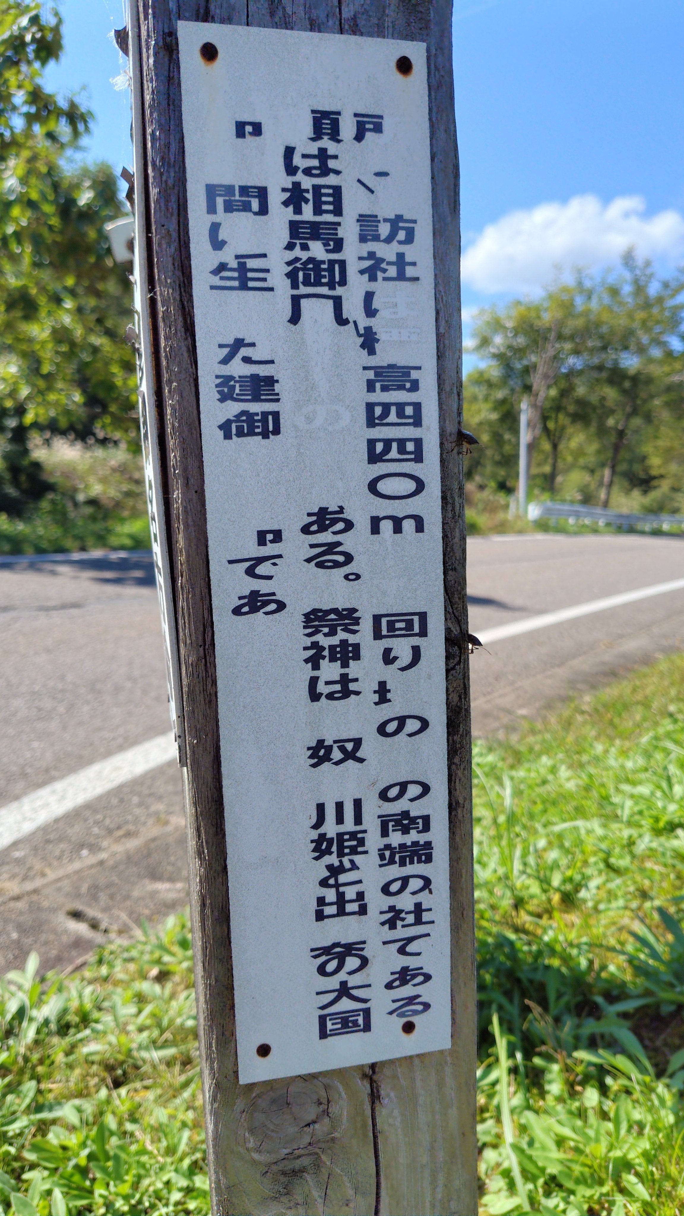 「社額は、相馬御風●の書である。祭神は奴奈川姫と出雲の大国主の命の間に生まれた建御名方命である。」
