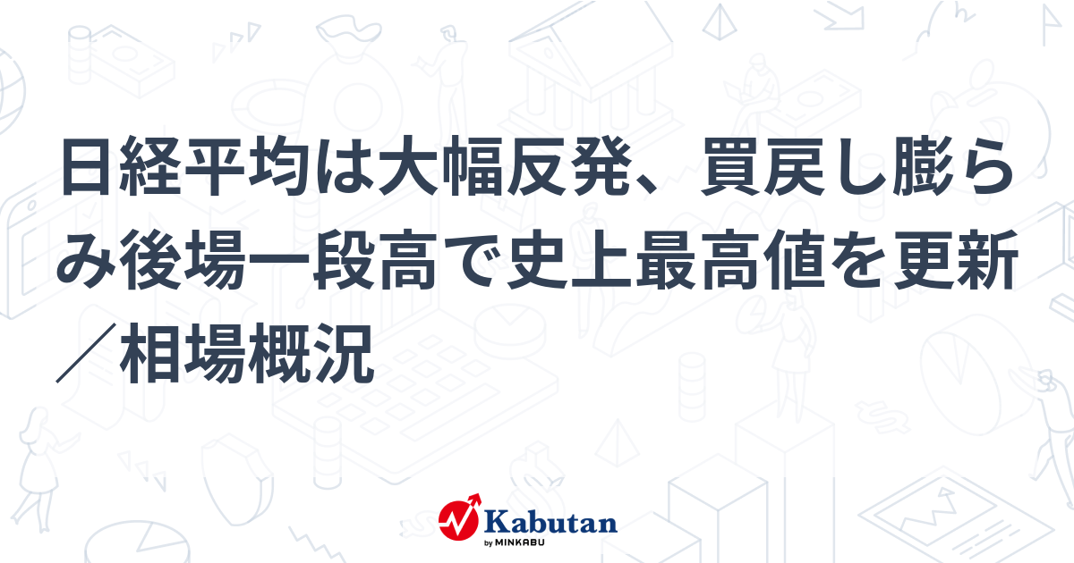 日経平均は大幅反発、買戻し膨らみ後場一段高で史上最高値を更新/相場概況 | 市況 - 株探ニュース8日の米国株式市場はまちまち。ダウ平均は31.08ドル安(-0.08%)の39344.79ドル、ナスダックは50.98ポイント高(+0.28%)の18403.74、S&P500は5.66ポイント高(+0.10%)の5572.85で取引を終了した・・・。kabutan.jp