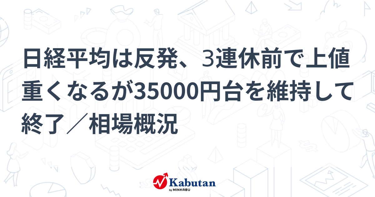 日経平均は反発、3連休前で上値重くなるが35000円台を維持して終了/相場概況 | 市況 - 株探ニュース8日の米国株式市場は反発。ダウ平均は683.04ドル高(+1.76%)の39446.49ドル、ナスダックは464.21ポイント高(+2.87%)の16660.02、S&P500は119.81ポイント高(+2.30%)の5319.31で取引を終了した・・・。kabutan.jp