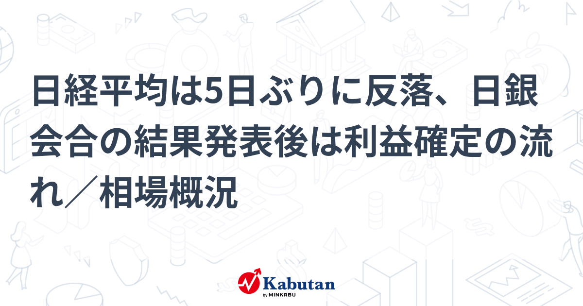 日経平均は5日ぶりに反落、日銀会合の結果発表後は利益確定の流れ/相場概況 | 市況 - 株探ニュース23日の米国株式市場は続伸。ダウ平均は408.34ドル高の44565.07ドル、ナスダックは44.34ポイント高の20053.68で取引を終了した。雇用関連指標が弱く、さらに半導体需要の低迷懸念浮上でハイテクが重しとなり・・・。kabutan.jp