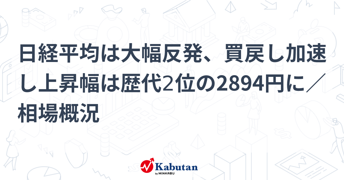 米国株の大幅反発と為替の円安推移などを材料に東京市場は買い戻し優勢でスタート。日経平均は、大型株の上昇や先物の買い戻しなどを材料に34000円台を一気に回復した。買い一巡後は、34000円半ばでのもみ合いとなったが、プライム市場の99%の銘柄が上昇する全面高の展開のまま取引を終了。なお、上昇幅は歴代2位となった。