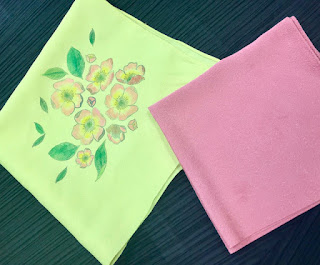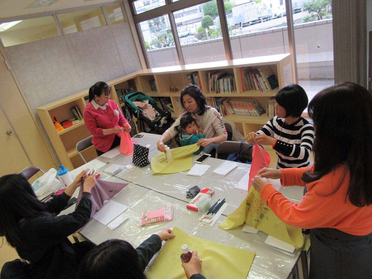 内容:中巾(約48センチ)無地ふろしきにスタンプとキットパスを使い、好きな柄をつけましょう。