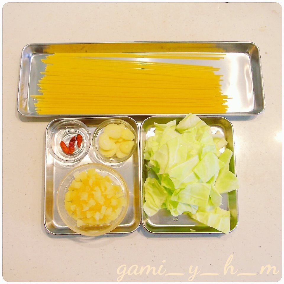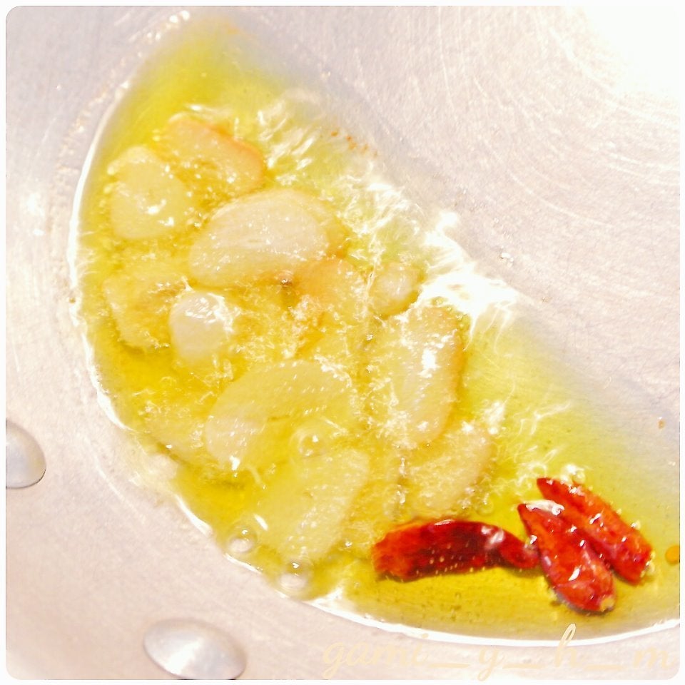 ・フライパンにオリーブオイルをひき、ニンニクと赤唐辛子を入れてから火をつけます。(初め中火でフツフツしてきたら弱火にします。)