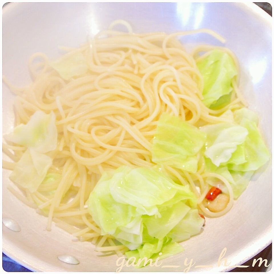 茹であがり1分前にパスタとキャベツをフライパンに移します。