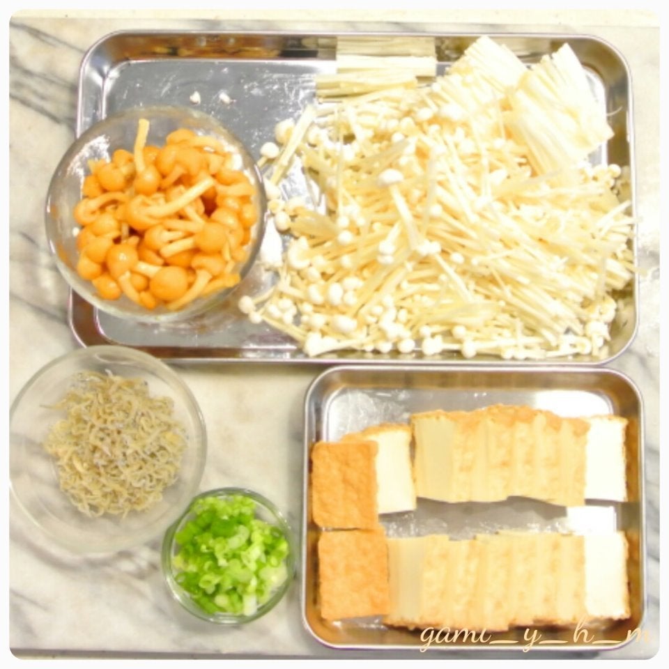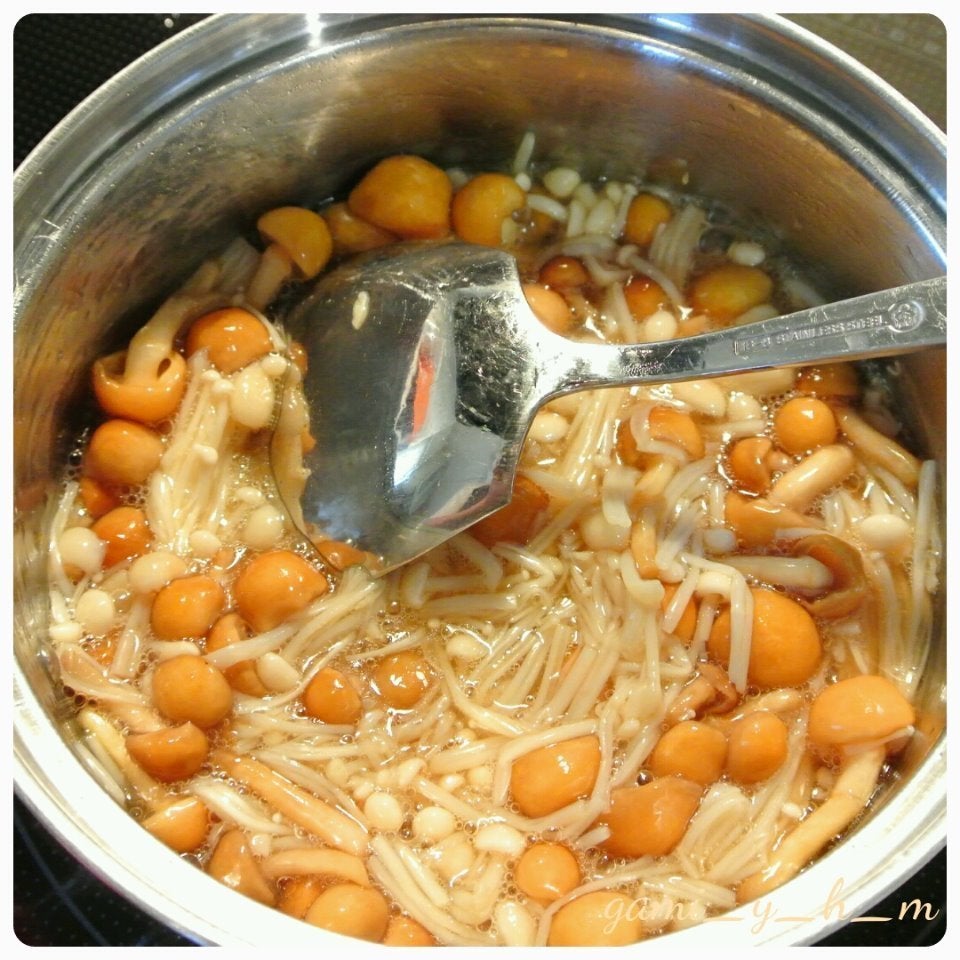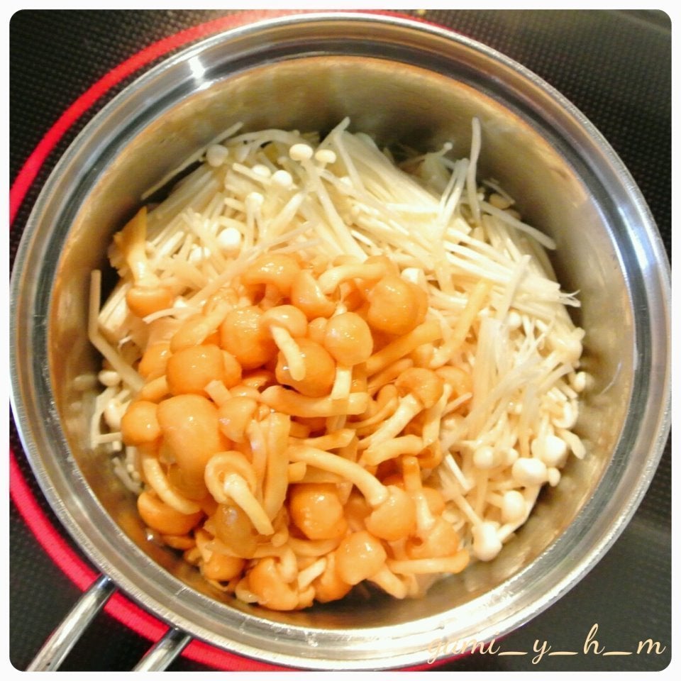・小鍋に小さじ1/2のごま油をひき、えのきとなめこを入れて中の弱火で炒めます。
