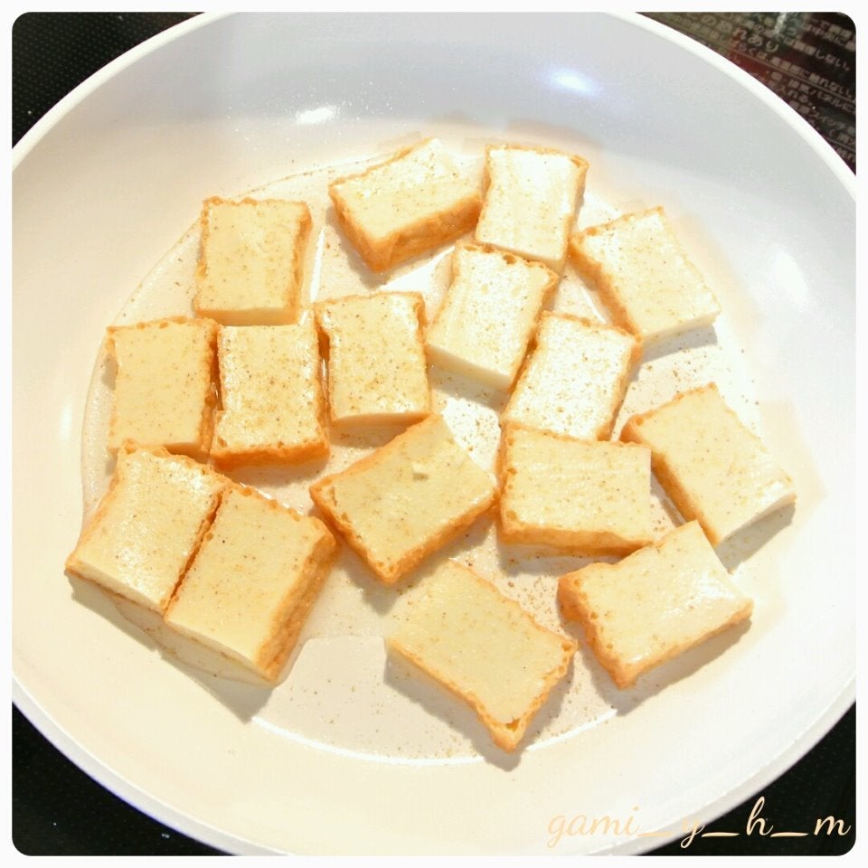 ・フライパンに分量のごま油をひき、厚揚げに軽く塩と胡椒で味付けをします。