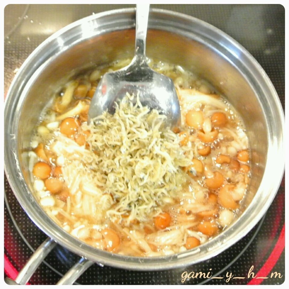 ・キノコ類に火が通ったらちりめんじゃこを加え軽く炒め、塩と胡椒で味を調えます。
