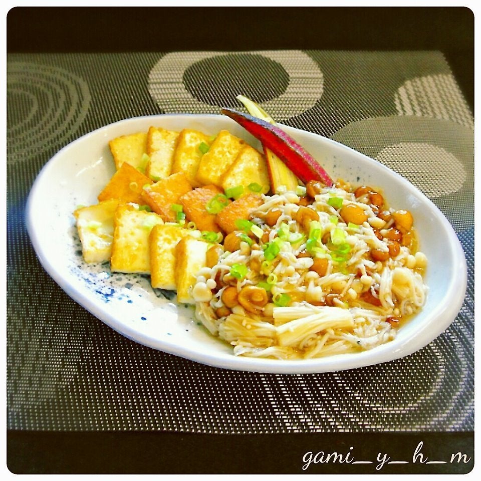 ・焼いた厚揚げを器に盛り、たっぷりのきのこソースをかけてネギを散らしたら完成です。
