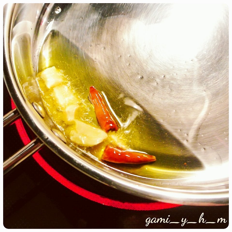 ・ソテーパンに大さじ2のオリーブオイルをひき、潰したにんにくと種を取った赤唐辛子を加えて弱火でにんにくが色づくまで加熱します。