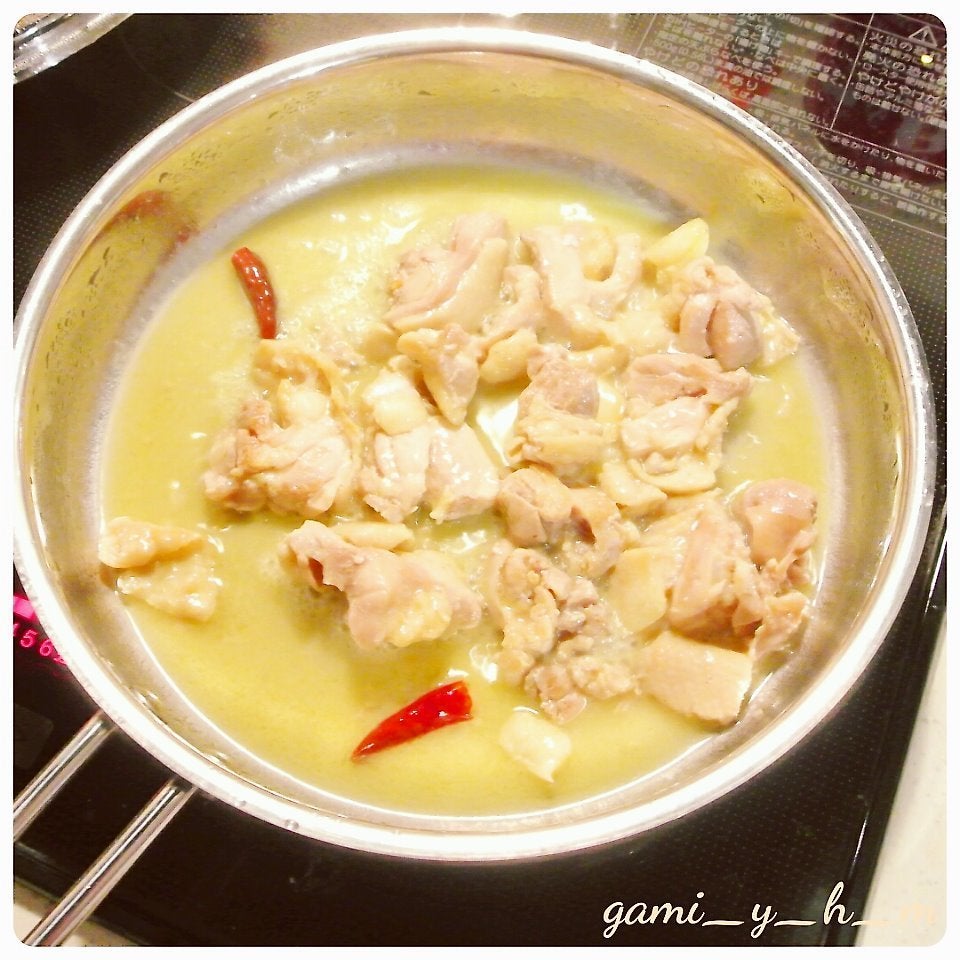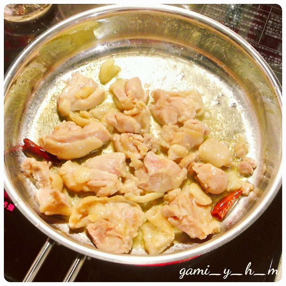 ・鶏肉に8割程度火が通ったら白ワインを加えます。