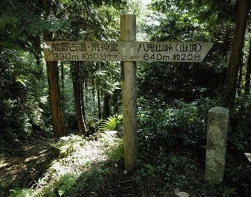 2009年8月8日:天気よく、体調も良かったので、熊野古道:西国一の難所八鬼山越えハイキングに行くことを決断。しかし指定席をとっていなく心配はあったが、桑名に向かう。幸いにも指定席がとれ、桑名発8時29分発のワイドビュー南紀に乗車。10時33分に尾鷲着。11時6分尾鷲駅口発の三交バスで瀬木山駅に11時20分着。潮風にあたりながら徒歩で八鬼山登り口に向かう。途中「熊野古道センター」に立ち寄る。その後登り口に向かう。12時20分登りに入る。美しい石畳と赤ペンキの落書きメッセージを見ながら「七曲り」など険しい道を進み14時30分頃八鬼山(627m)峠着。「さくらの森エリア」に向かい熊野の大海原の絶景を観る。「江戸道」は険しそうなので、峠に戻り「明治道」を下る。石畳は苔が生えて滑るので難儀した。増水した川、滝を徒渉するところもあり危険を感じた。しかし滝があり苔むした自然の庭園ありの景色を堪能できた。16時20分頃長柄一里塚に着く。急いで三木里駅に向かう。16時45分着。17時09分発で尾鷲駅に向かい、しばらく駅周辺を散策後18時15分発ワイドビュー南紀に乗車。桑名に20時30分に着。 これで、馬越峠、ツヅラト峠コースを含め3コースを完歩。本コースが一番難コースでした。