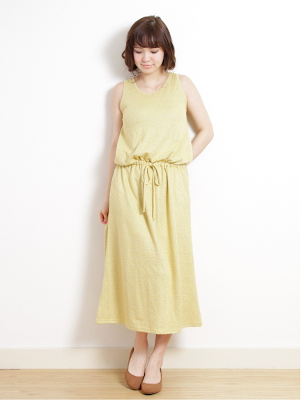JQタンクマキシワンピース変り織りジャカードのタンクマキシワンピース。柄が独特なカットソー素材を贅沢に使用。ウエストのブラウジング紐でシルエットが変化するのがオススメポイント。デニムシャツを羽織ったり、カーディガンやジップパーカーを羽織ったり落ち着いたトーンなので着易い一枚。真夏まで着られるアイテム。※インナーワンピース着用・JQタンクマキシワンピース
