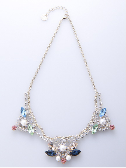 パール&ビジューネックレス色とりどりのビジューと淡水パールを使用したネックレスは、パッと目を惹くほど存在感があります。全てクリスタルガラスの石を使用しているので、輝きが違います。カラフルなビジューが首元を華やかに見せてくれます。パール&ビジューネックレス