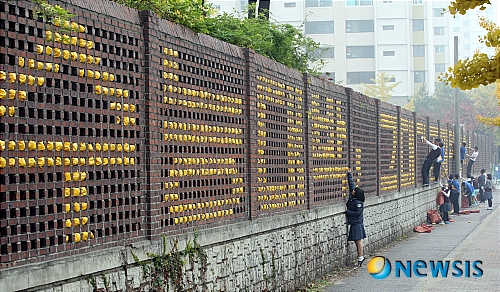 この単語をテレビや雑誌、新聞などで、もしくは道でもよく耳にする時期がありますが、それは大学受験がある11月なのです。日本のメディアにもよく出ていてもう知っている方も多いと思いますが、韓国ではその一日ですべてが決まるので会社員の出勤時間を遅らせたり、飛行機も飛ばさないという噂があるぐらいとても重要なイベントです。その日を迎える頃には 수능대박 (すぬんでばっく)というキャッチプレーズを大学受験生によく言うのです。この写真は先輩たちのために学校のフェンスに수능대박という文字を飾っている高校生の姿ですね。