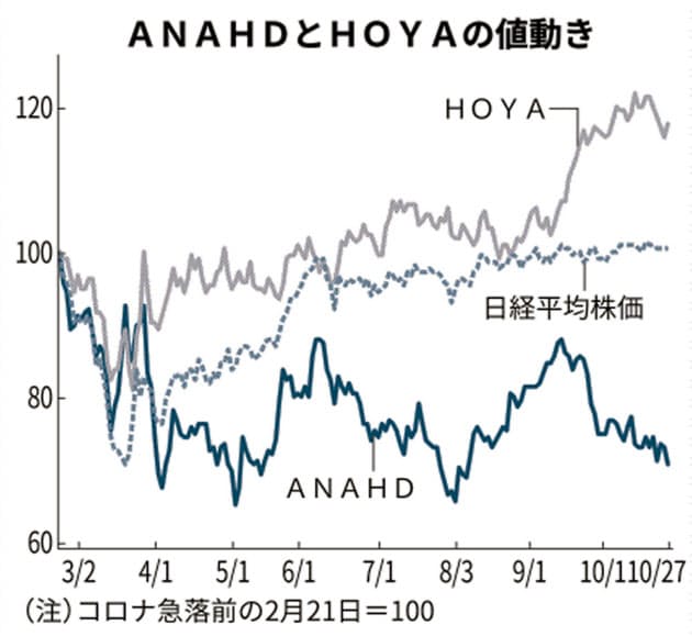 28日午前の東京株式市場で、前日に2020年4~9月期決算を発表したANAホールディングスとHOYAの株価が明暗を分けた。EUV(極端紫外線)技術への期待でHOYAが上場来高値を更新する一方、大がかりな構造改革を打ち出したANAHDは朝高後、売りに押された。ウィズコロナで選別される二極化相場の「K」字が大きくなってきた。