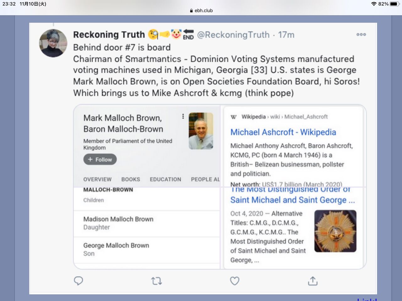 Smartmanticsの会長-DominionVoting Systemsは、ジョージア州ミシガンで使用されている投票機を製造しました[33]米国 州はジョージ・マーク・マロック・ブラウンであり、オープンソサエティ財団理事会に所属しています。こんにちはソロス! それは私たちをマイク・アシュクロフトとkcmg(教皇と思います)に連れて行きます