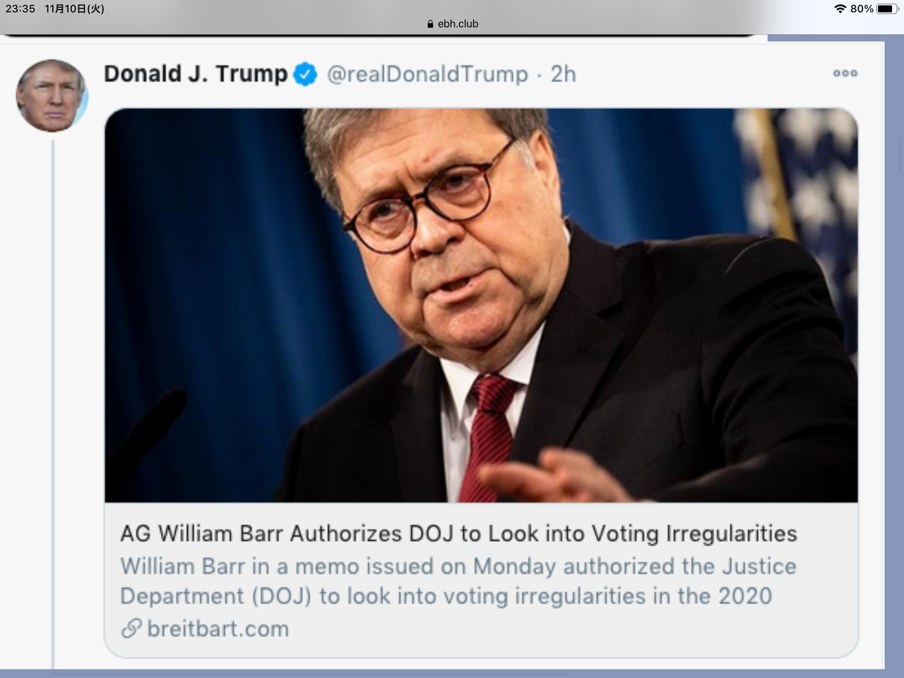AG ウイリアム・バー(William Barr)は、司法省(DOJ)に投票の不規則性を調査することを許可しました。