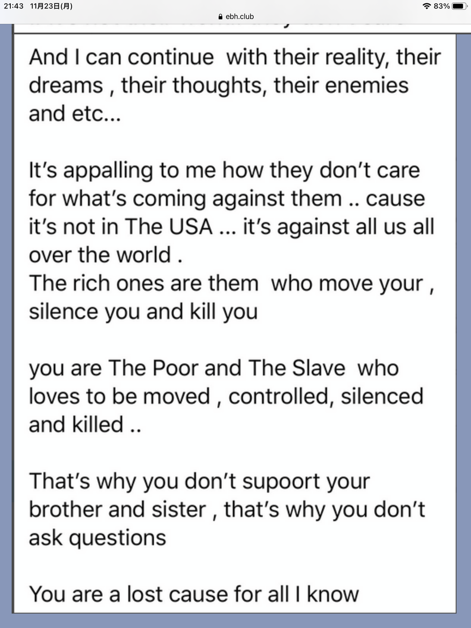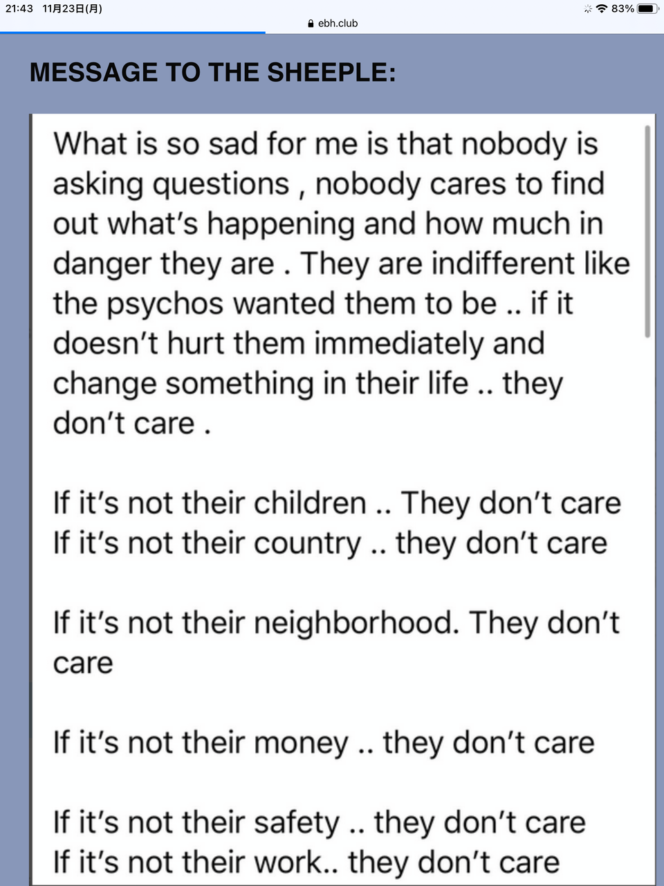 私にとってとても悲しいのは、誰も質問をしていないことです。何が起こっているのか、どれだけ危険にさらされているのかを誰も気にしません。 彼らはサイコが望んでいた無関心なライムです..それがすぐに彼らを傷つけず、彼らの人生の落ち着きを変えなければ..彼らは気にしません。