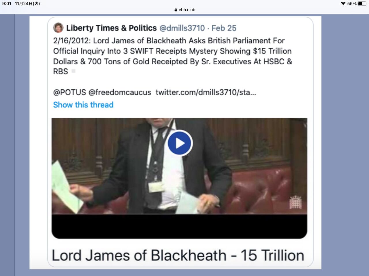 2012年2月6日:ジェームズのブラックヒース卿が英国議会に、HSBCとRBSの上級幹部が受け取った15兆ドルと700トンの金を示す3つのSWIFT領収書ミステリーの公式調査を依頼
