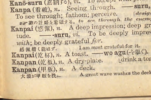 国会図書館のデジタルアーカイブスを確認すると、たとえば1909(明治42)年に出版された『和英辞典:新訳』(三省堂)には「Kanpai」が英語の名詞「toast」と同じ意味であることが示され、「乾杯をあおぐ」が例文になっている。