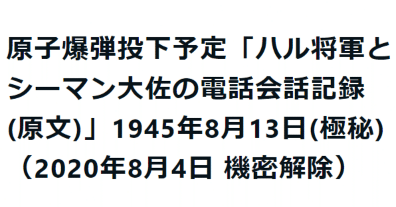 原子爆弾投下予定「ハル将軍とシーマン大佐の電話会話記録(原文)」1945年8月13日(極秘)(2020年8月4日 機密解除)