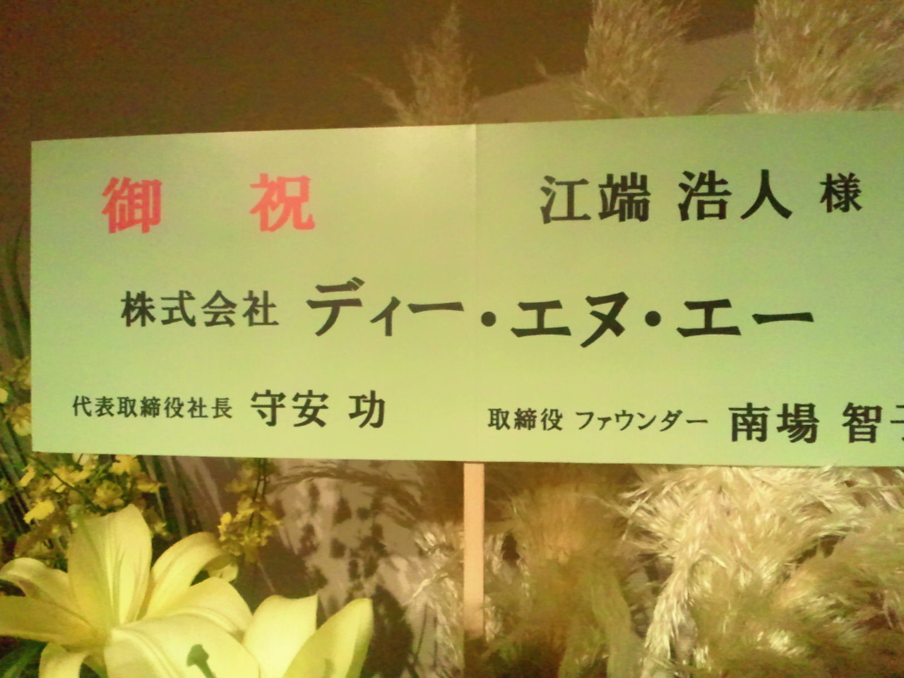 黄色い、秋らしい素敵なお花はDeNAの南場さんと守安さんから