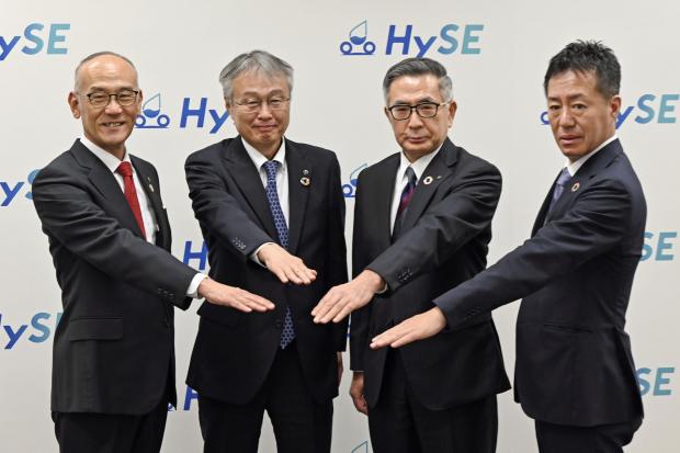 水素エンジン研究で連携へ バイク4社、開発後押し - ライブドアニュース記者会見で写真に納まるバイク大手4社の幹部ら。左端はヤマハ発動機の日高祥博社長=17日午前、東京都内カワサキモータース、スズキ、ホンダ、ヤマハ発動機のバイク大手4社は17日、水素エンジンの基礎研究を目的とnews.livedoor.com