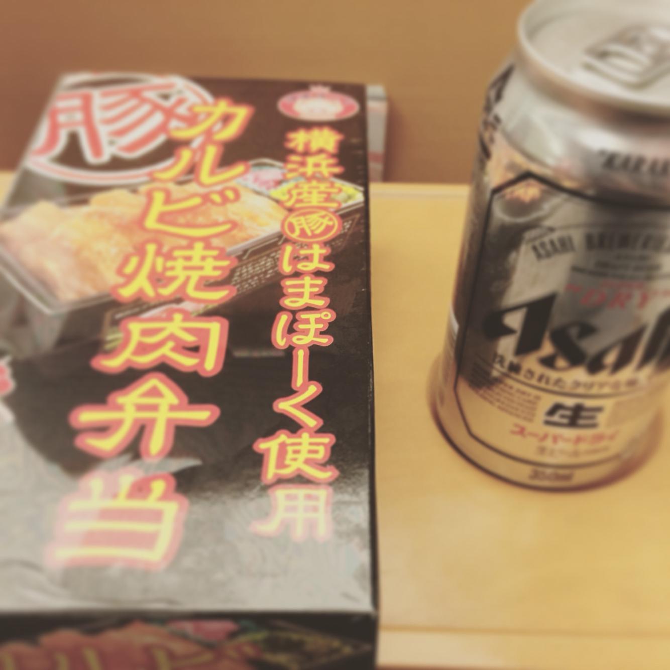 昼ビール。お弁当まったくロマンスがない。笑