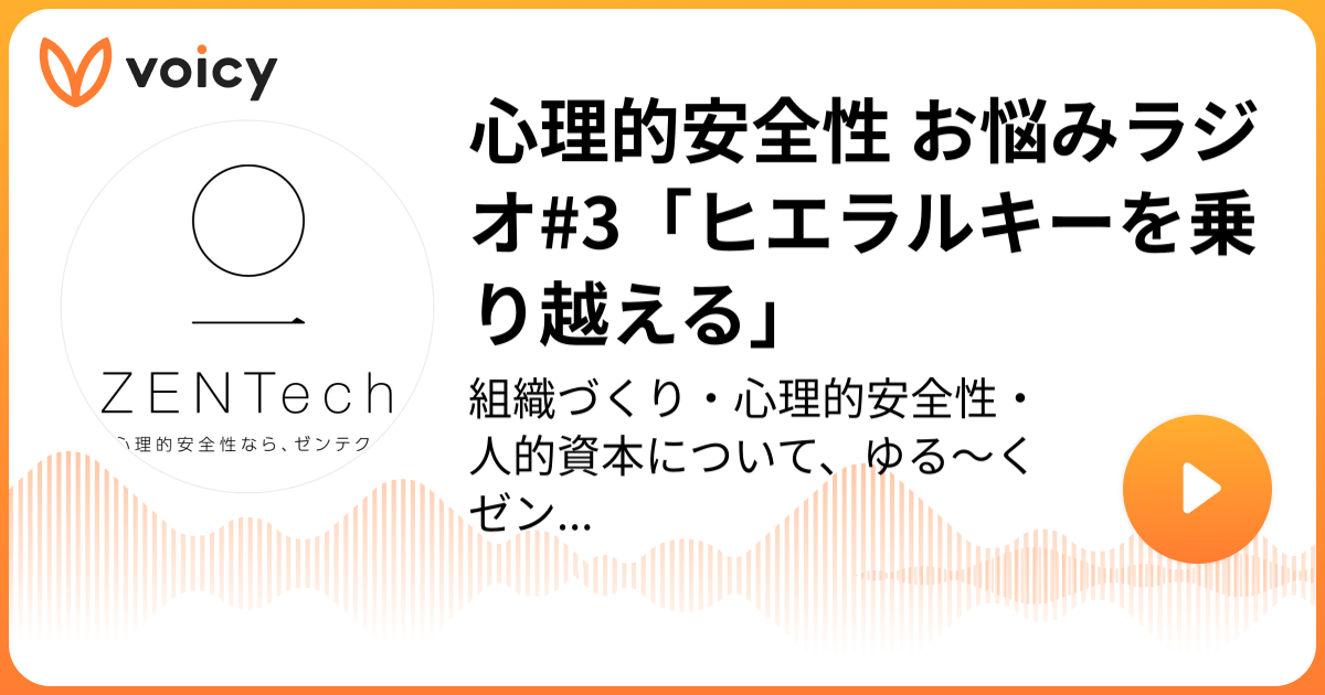心理的安全性 お悩みラジオ#3「ヒエラルキーを乗り越える」 | Ryosuke ISHII@ZENTech「組織づくり・心理的安全性・人的資本について、ゆる〜くゼンテク講師陣で語ります」/ Voicy - 音声プラットフォーム音声放送チャンネル「Ryosuke ISHII@ZENTech」の「心理的安全性 お悩みラジオ#3「ヒエラルキーを乗り越える」(2025年1月30日放送)」。Voicy - 音声プラットフォームvoicy.jp