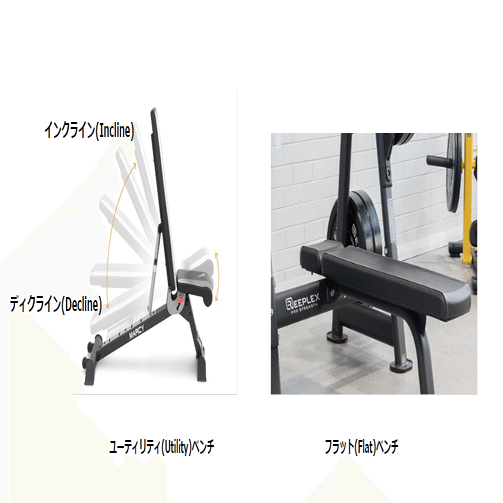 ベンチは座ったり横になって運動するための器具です。種類としては、背板の角度を調節できるユーティリティベンチと、固定されているフラットベンチがあります。ユーティリティベンチは、水平を基準に背板の角度が上がればインクライン、下がればデクラインと呼ばれます。フラットベンチは主にベンチプレスなどに使用されます。