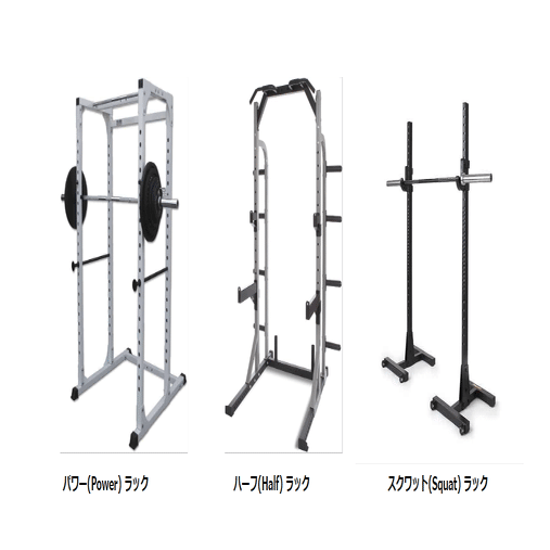 ラックはバーベルをかけることができるスタンドで、さまざまな種類のバーベル運動を行えます。パワーラック、ハーフラック、スクワットラックなどの種類がありますが、すべてのラックにはバーベルをかけるためのフックが一定間隔で配置されており、運動の種類に応じて高さを調節できます。
