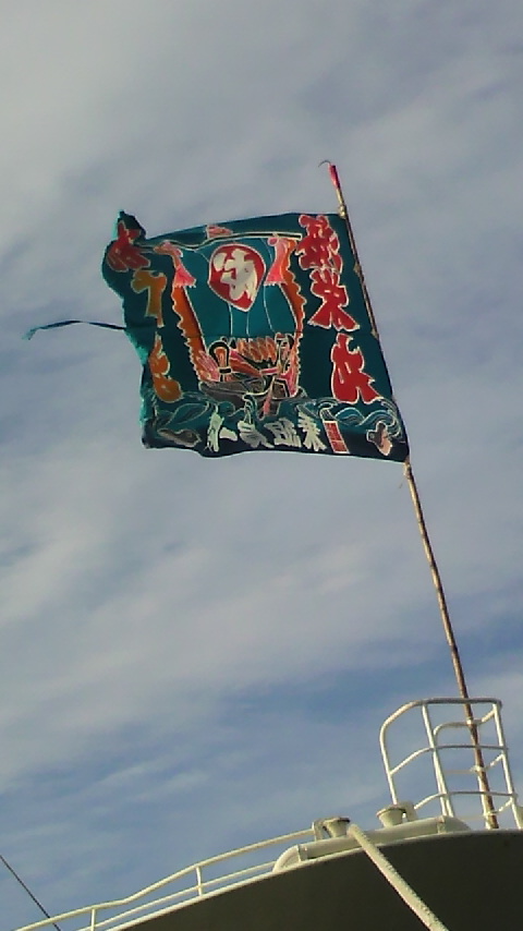 「大漁旗」は、昔は文字通り、「海」から帰る「漁船」が「陸」の人たちに「大漁」を知らせる「合図」の「旗」でしたが、現在は「新造船」の「船主」へ「祝い」として「親戚」や「取引関係者」から贈られています。