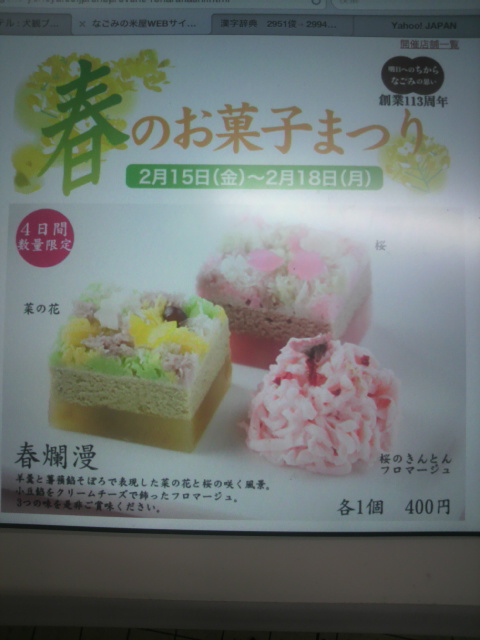 「イベント期間限定」の「季節」の「お菓子」ですが、「桜」、「菜の花」、「桜のきんとんフロマージュ」が「数量限定」で販売されます。