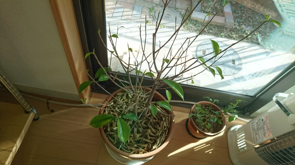 植木鉢の中に枯れ葉が積もっているので、わかると思いますが、次々と落葉してしまいました。室内の気温は、最低でも5℃くらいは保つので、風が無ければ冬越しできるはずだったのですが、風が当たったせいで体感温度が下がったと思います。あちゃ~。