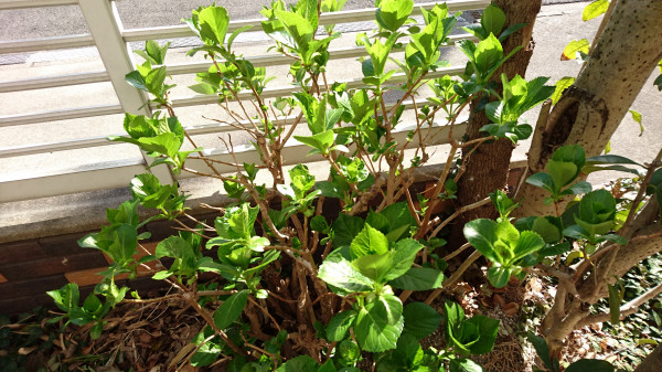 こちらは西洋アジサイです。こちらもほとんどの枝からツヤツヤの葉っぱが出てきました。今年も大きくなりそうです。このくらいのボリュームで収まると可愛いのですが、たぶん、高さ、幅ともに2倍位の大きさになるだろうなあ。