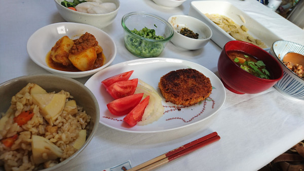 タケノコが旬を迎えましたね。いつも買い物に行くJAでは、掘りたてのタケノコや、茹でタケノコがたくさん並んでいます。今日は茹でタケノコを買ってきて、今年初めてのタケノコご飯を炊きました。
