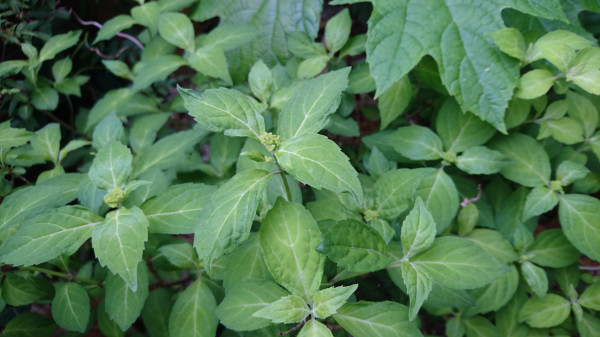 カシワバアジサイの隣にあるヤマアジサイです。枝も細くてヒョロヒョロとしていますが、元気に葉っぱを広げています。小さなつぼみも出ています。