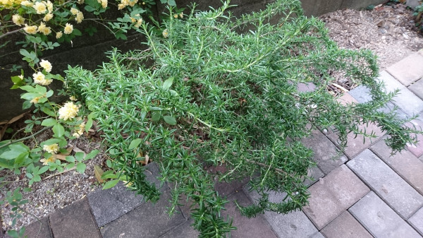 ローズマリーも青々とした葉を伸ばしています。このローズマリーは枝が下へ垂れ下がる性質なので、地面に着きそうな枝は切り落として、葉をバラバラにほぐして、玄関の消臭に使いました。