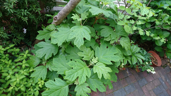 最初の写真はカシワバアジサイです。大きな葉っぱを目一杯広げています。緑色を眺めていると“目”が癒やされますね。