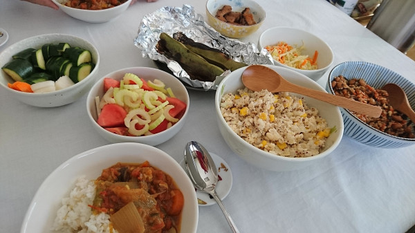 トマトとセロリのサラダ(そのまま食べます)、ぬか漬けのズッキーニと大根と人参、おからツナサラダ、麹納豆、空豆、キャベツの塩麹漬け、鮭の焼き漬けなどを食べました。麹納豆はいつもはお味噌汁に入れて食べるのですが、今日の献立では食べにくかったです。