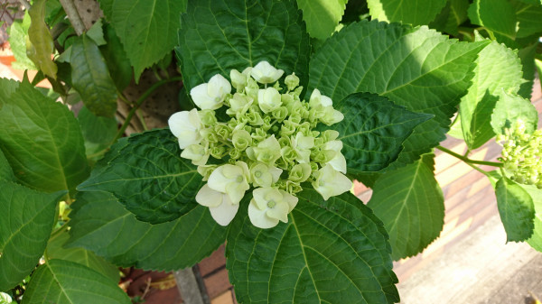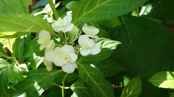 ひ弱な細い枝のヤマアジサイは、カシワバアジサイの影にかくれていますが、しっかりと咲いています。ずっと前に、実家の母が苗をくれたのですが、母いわく「そんなの、あなたにあげたっけ?」と忘れちゃっているアジサイです。