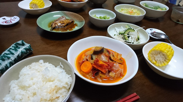 他にも茹でトウモロコシ、ゴーヤとさらし玉ねぎのツナサラダなど、夏野菜いっぱいの食卓でした。だーりんが食べている魚はニギスの煮付けです。
