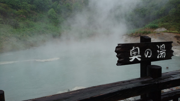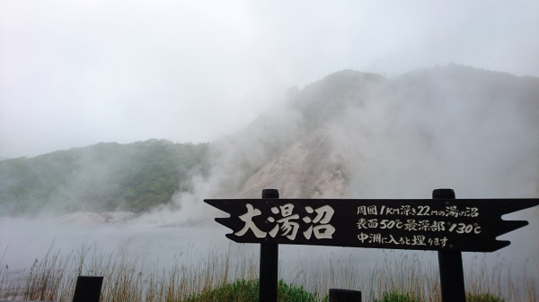 大湯沼は、私たちが泊まった宿の裏手の山のあたりで、宿はここからお湯を引いているそうです。(運転手さん談)湯けむりがすごい。そしてまさに“地獄”と言うのがぴったりな景観ですね。表面でも50度!手も入れられない熱さですね。