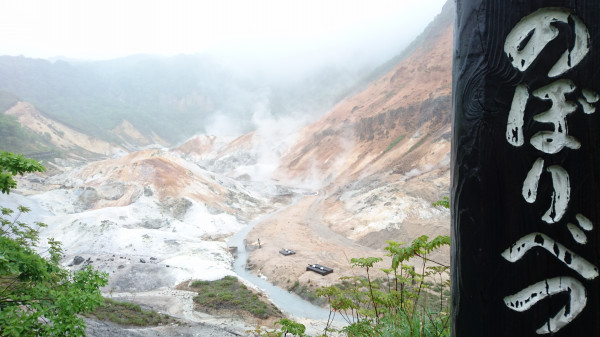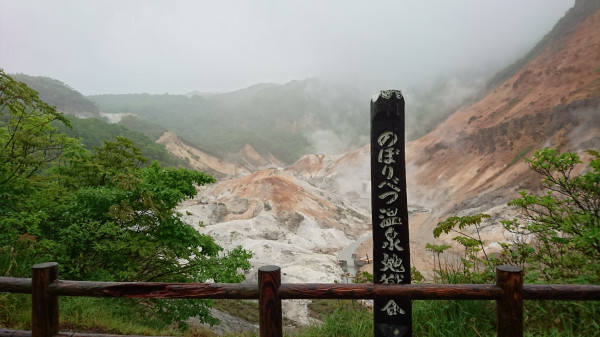 登別は、残念ながら今朝も雨が降っています。宿をチェックアウトしてから、あらかじめお迎えを頼んでおいたタクシーで、駅に向かうことにします。タクシーの運転手さんに、途中で地獄谷を見たいと伝えると、オススメの場所に連れて行ってくれました。