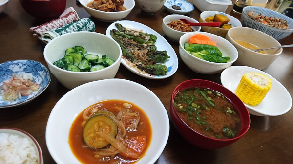 それから、甘長唐辛子はグリルでサッと焼いておかか醤油でいただきました。美味しかった。他には、かぼちゃの煮物、トウモロコシ、ぬか漬け、麹納豆、キュウリの塩麹漬けなどでした。