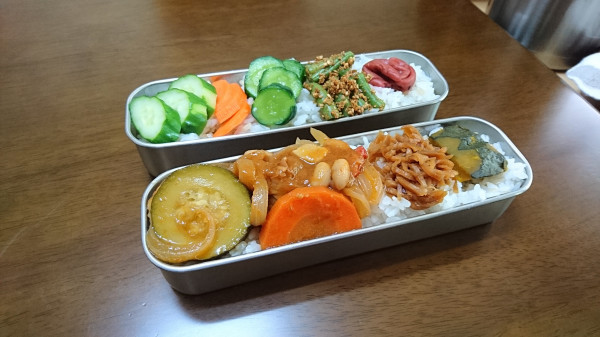 他のおかずは、新生姜の佃煮、かぼちゃの煮物、ぬか漬けのキュウリ、人参、それからキュウリの塩麹漬け、さやいんげんのゴマ和え、梅干しでした。