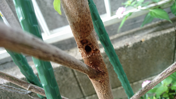 ネットで調べてみたら、ハナミズキの幹に穴を開けてしまうのは、カミキリムシの幼虫の「テッポウムシ」らしいです。実際には見たことはありませんが、以前にカリオプテリスの幹にも穴を開けられていて、枯れてしまったことがありました。