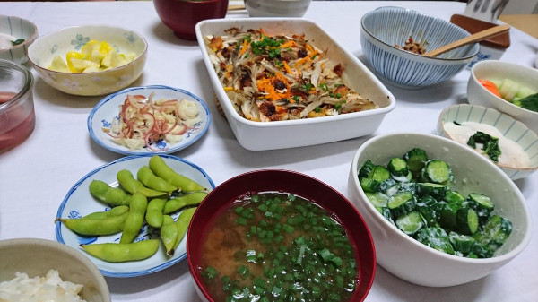 他には、長芋とモロヘイヤのネバネバ和え、キュウリの塩麹漬け、UFOズッキーニの塩麹和え、ぬか漬けの黄ュウリ、人参、キュウリでした。