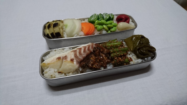 鯛の隣りはゴーヤの味噌佃煮、さやいんげんのゴマ和え、ピーマンのまるごと煮、上段は、ぬか漬けの水ナス、黄ュウリ、人参、それから枝豆、キュウリの塩麹漬け、らっきょう、梅干しでした。